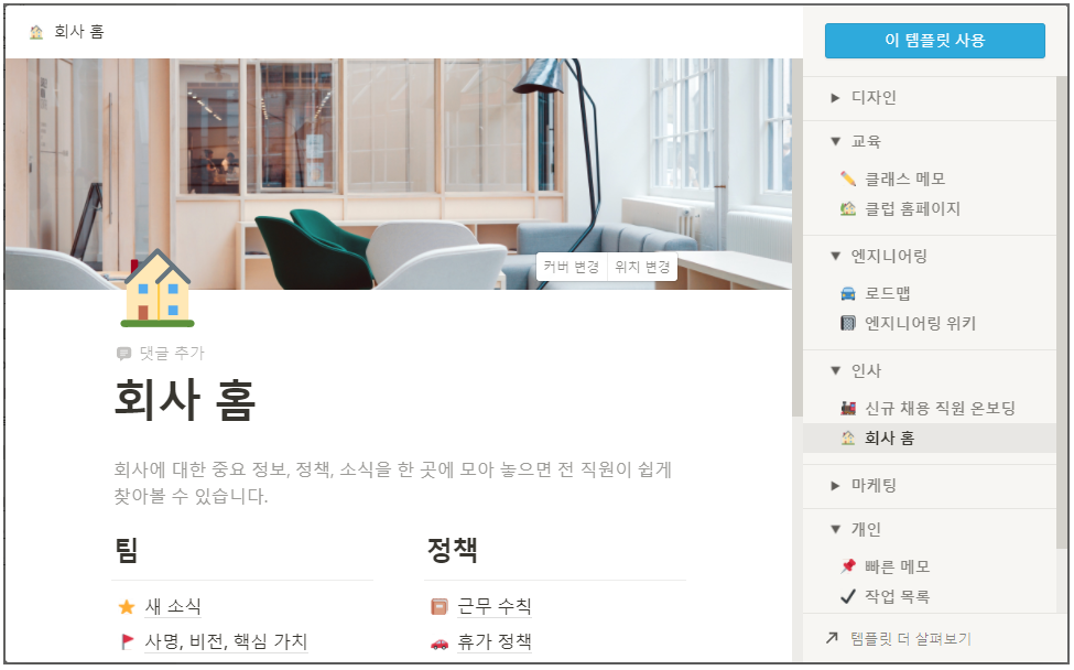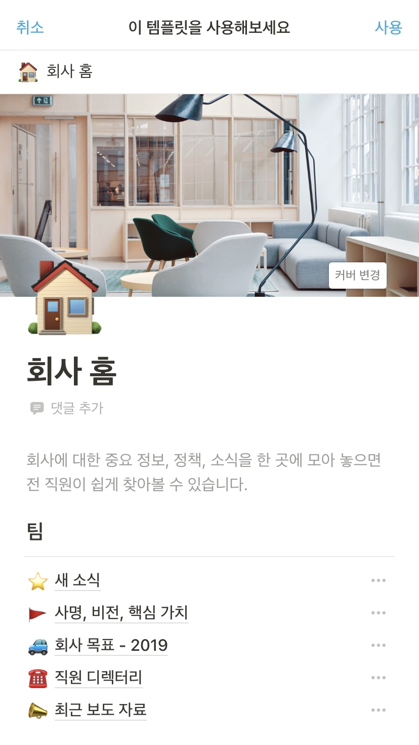 4. 업데이트 완료. 노션의 여러가지 템플릿도 한국어로 잘 변환된 것을 볼 수 있다. 스마트폰에서도 바로 적용됨.